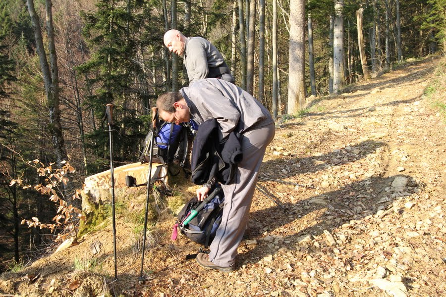 Zatem smo nadaljevali po makadamski cesti in mimo nekega manjšega zavetišča, nato se je spet začela gozdna steza, kmalu pa smo prispeli do planinske koče na Kofcah. Tu smo na hitro spili čaj in krenili na Veliki Vrh. Tomaž je predlagal strateški napad po grebenu z južne strani, ki se je izkazal za nekoliko nevarnega, saj bi nepravilen korak lahko za nerodneža pomenil hitro in neprostovoljno spremembo nadmorske višine.