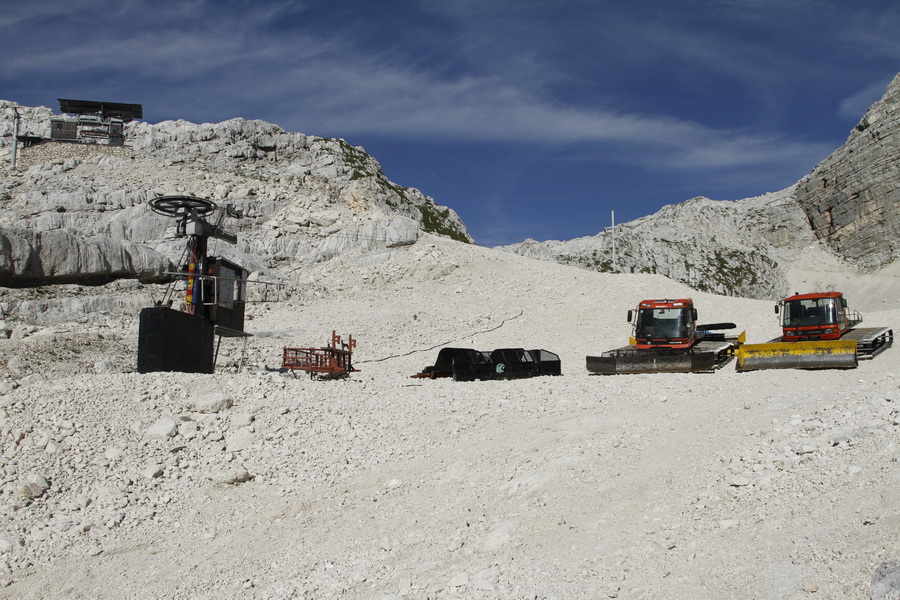 Uspešno smo krmarili med razpokami, počasi prečili ledenik in se vzpenjali proti zgornjemu ozkemu skalnemu prehodu. Naša pot se je križala z Italianskim parom iz Trsta, ki je skoraj istočasno štartal iz koče. Družno smo nadaljevali in nekje na sredini ledenika je pričelo nekaj pokati, kod da poka ledenik.