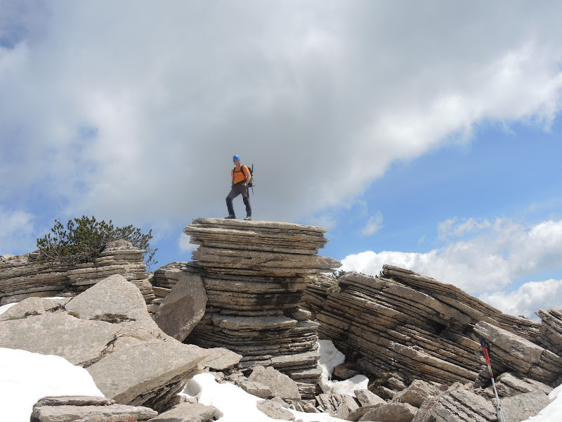 Nadaljevali smo zopet po južni strani pogorja, kjer je bilo več snežnih predelov. Na vrhu grebena je zanimiva skalnata slika. Kamnite plošče, naložene eno nad drugo, so poimenovali »knjige sv. Daniela«. Pred nami pa je bil že vrh Monte Sterpeza 2215 m, ki smo ga kmalu osvojili.